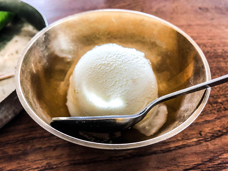 The restaurant served handmade kesar-vanilla ice cream for dessert. It was tastier than the ones that we have from the vendors since it was creamier. The paan was served at the end. However, I did not like the taste because of its blandness. We ended with cleaning our hands with hot water bowls.