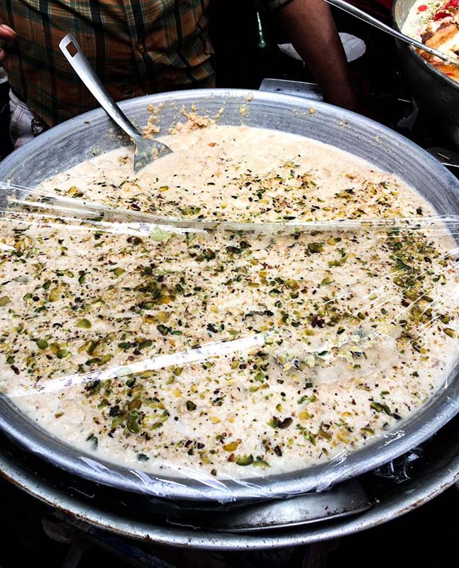 Daulat ki Chaat is an Old Delhi speciality that is only available between November and February. The texture is what makes it so unique. The milk is churned for hours and kept out in the cold overnight on an ice slab to get a foamy and frothy texture that melts instantly in the mouth, leaving a sugary taste behind.