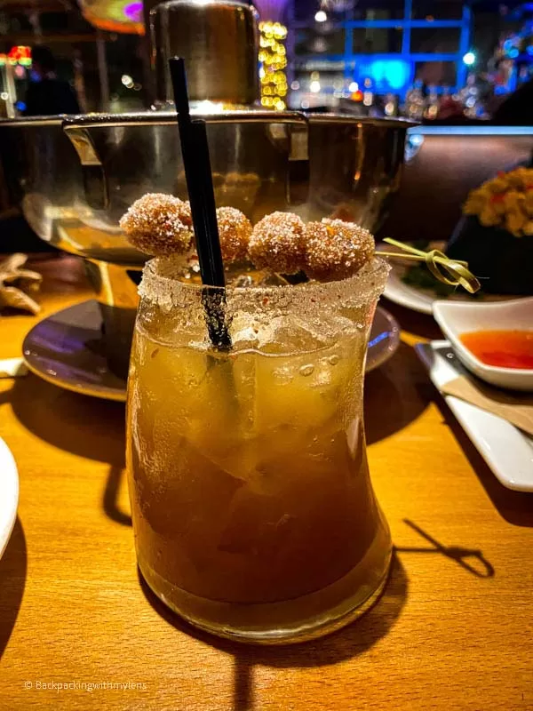 We ended the night on a sweet note with a spectacular dessert called Bua Loy. The dessert is made with balls of rice flour cooked in sweet coconut milk, served in a tender coconut, and wrapped in pandan leaf. We finished it in no time and then enjoyed scooping and devouring the sweet, fresh, and tender coconut meat.