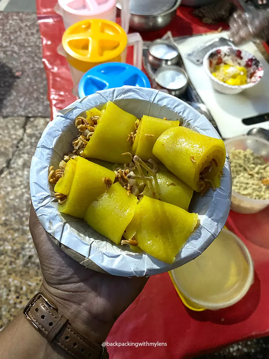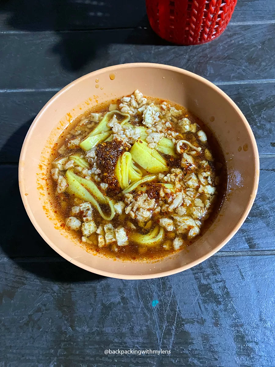 The Dry Laphing is made of thick hand-pulled noodles mixed with various spices, minced meat, and crushed Wai Wai for the crunch (offered only by selected vendors). The look reminds me of a Gujarati dish called Khandvi.