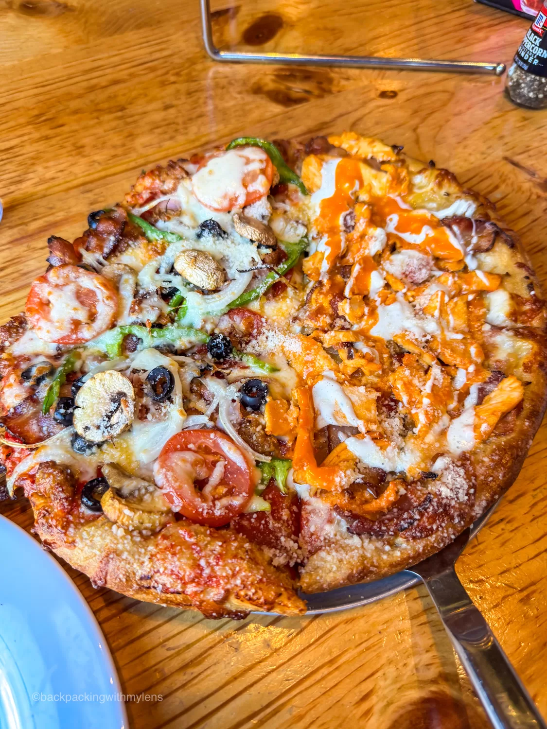 - Mellow Mushroom Williamsburg – We dined here because we were craving some freshly baked pizza. Mellow Mushroom is a popular pizza chain known for its stone-baked, creative pizzas and pretzels. Everything we tried was absolutely delicious, especially the half-and-half pizza. It was easily one of the best Buffalo chicken pizzas I’ve had to date. I highly recommend this place. 😋🌟