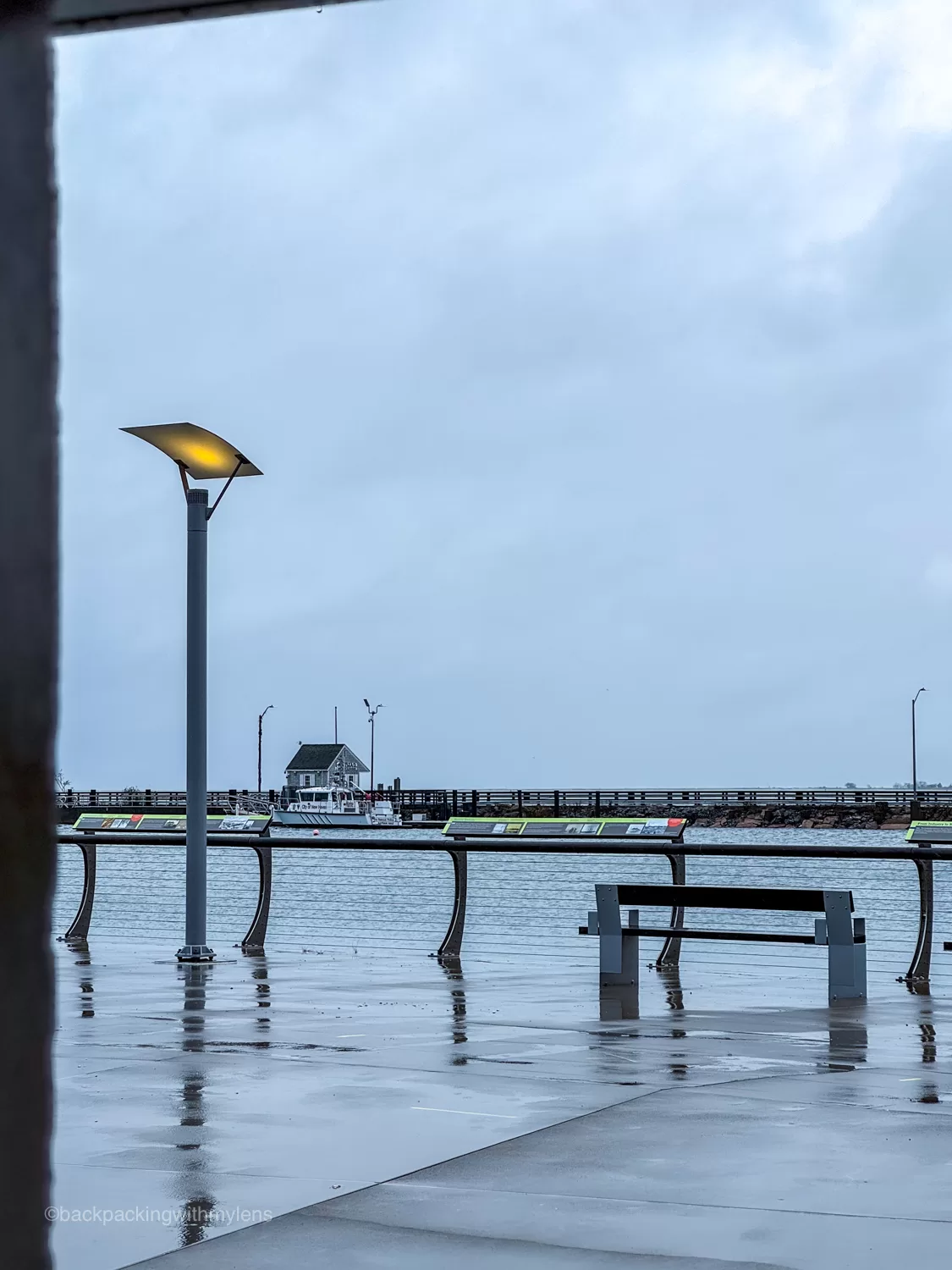Long Wharf Park is located on the shores of Long Island Sound and is known for its pristine boardwalk and pier. On a clear day, you can see blue water, a sky full of shore birds, and people enjoying the sun and fresh breeze by the park. It wasn’t the ideal day to visit the shore, but I still wanted to see this place. I made a short stop here to take in the view. The visibility was not great, but it gave me major Pacific Northwest vibes.