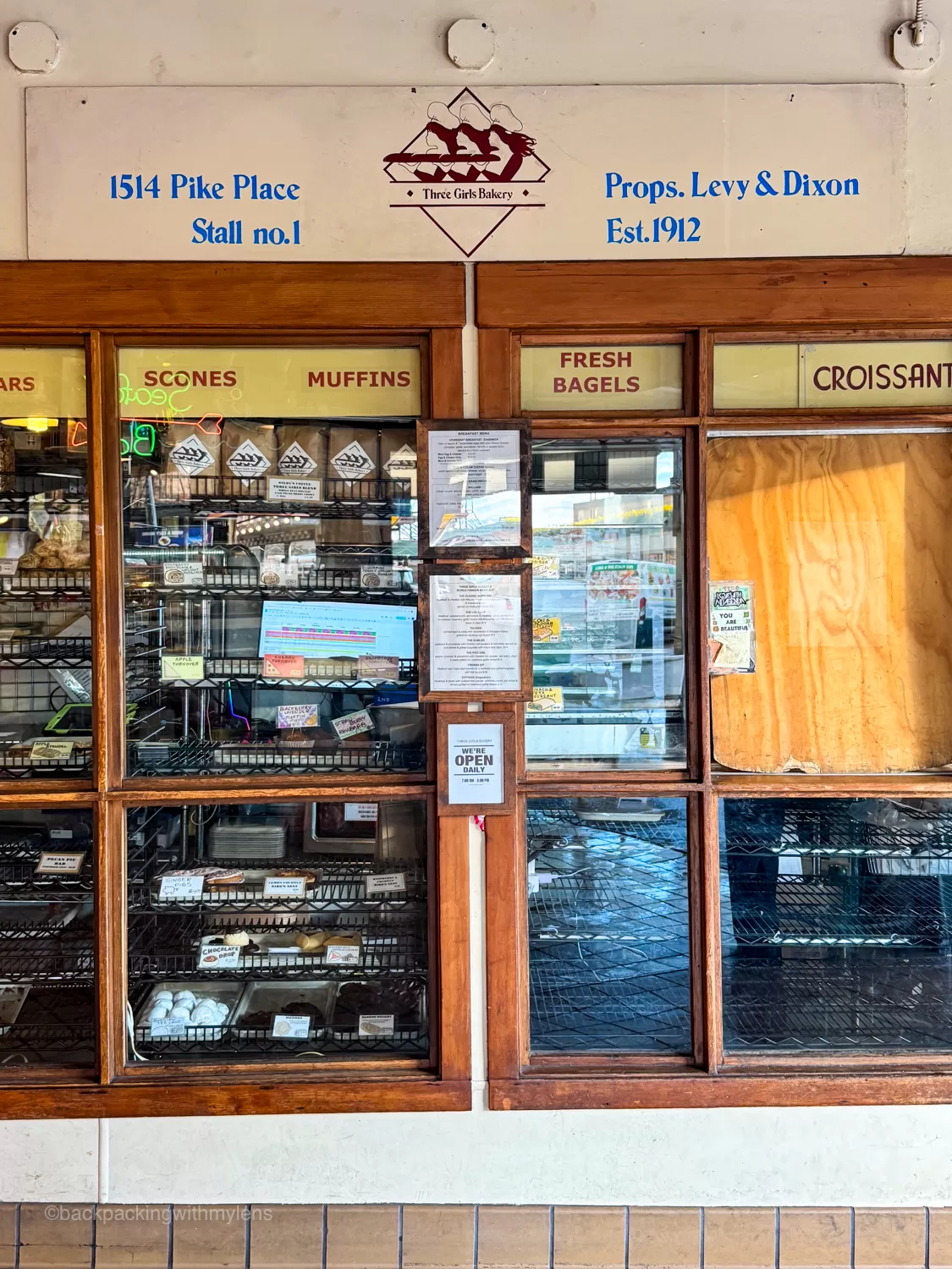 Opened in 1912 by three women bakers, Three Girls Bakery is one of the oldest food businesses in Pike Place Market and still draws a steady stream of both locals and visitors. Stop by the Sanitary Market window for fresh baked bread, cookies, and rugelach, or slide onto a stool at the tiny lunch counter for hearty soups and old school sandwiches piled high on house made loaves. We can never stop at one pastry and you can clearly see that in the photo. 🤣