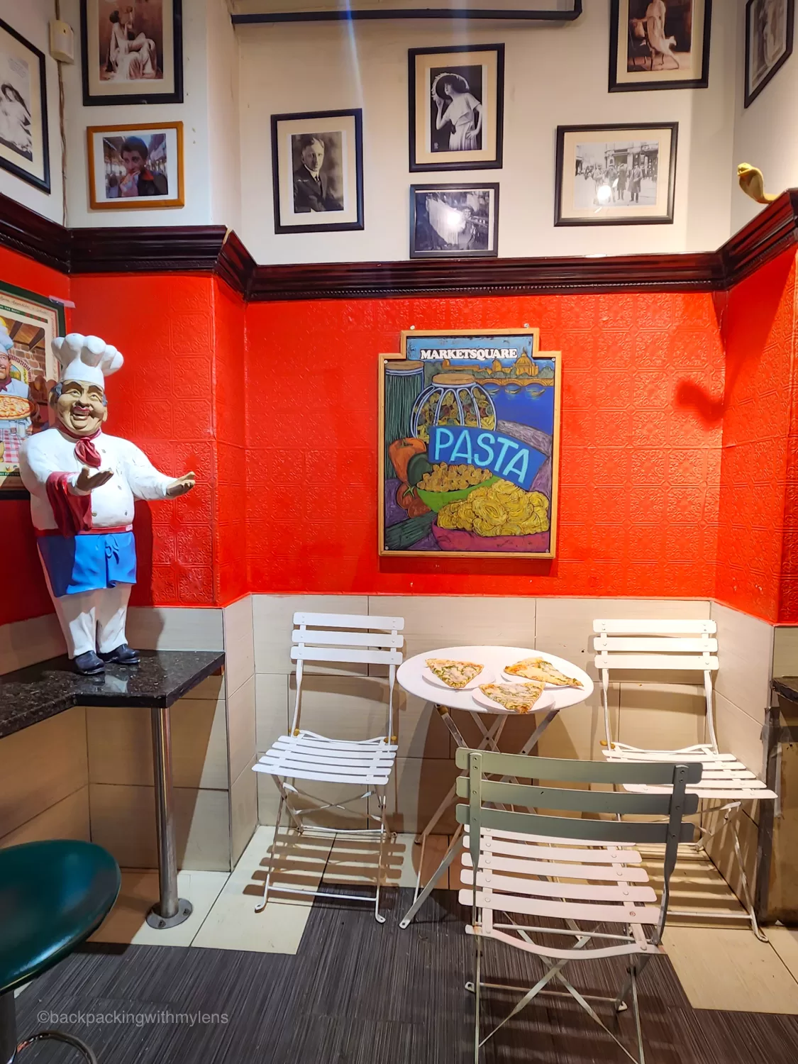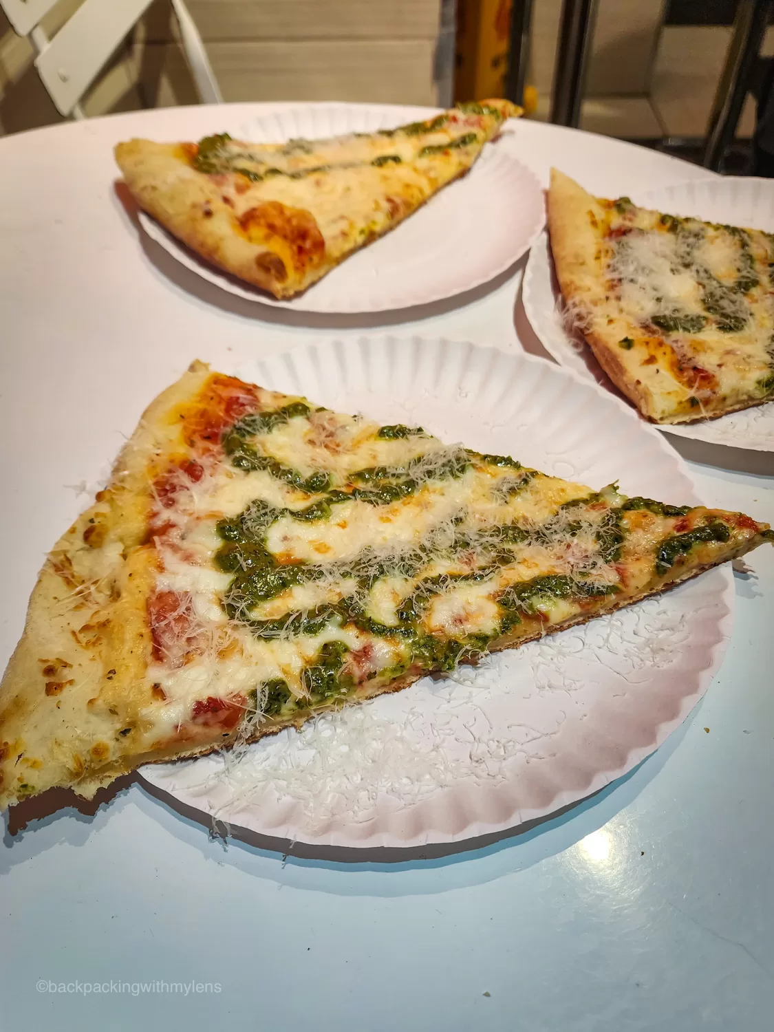 The ambiance was cozy, and the best part was that they offered pizza by the slice, allowing us to try a few different varieties. I ordered my favorite, pesto and cheese pizza, which was absolutely delicious. The crust was perfectly done, with a generous topping. Plus, the prices were very affordable, making this a great spot for budget travelers.