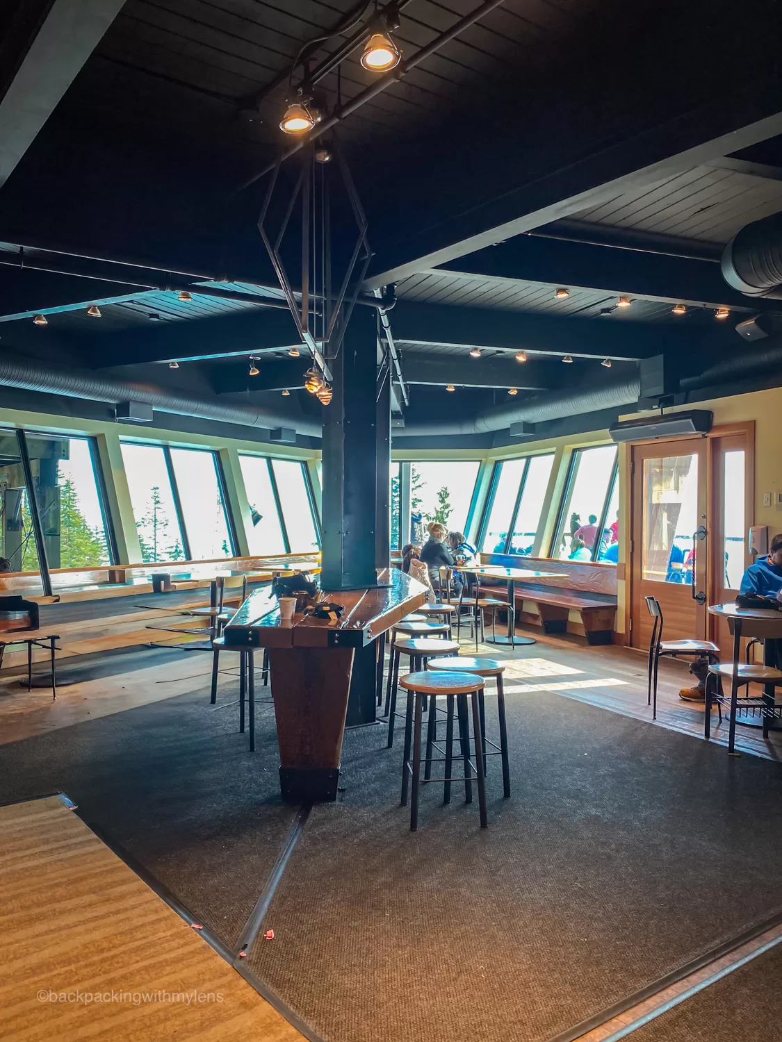 The cafeteria offers both indoor and outdoor seating options. The interior, designed with rustic wood, perfectly complements the snowy peaks in winter and the lush greenery during summer. Plus, you can watch the Skyride gondola going up and down, which adds to the overall experience.