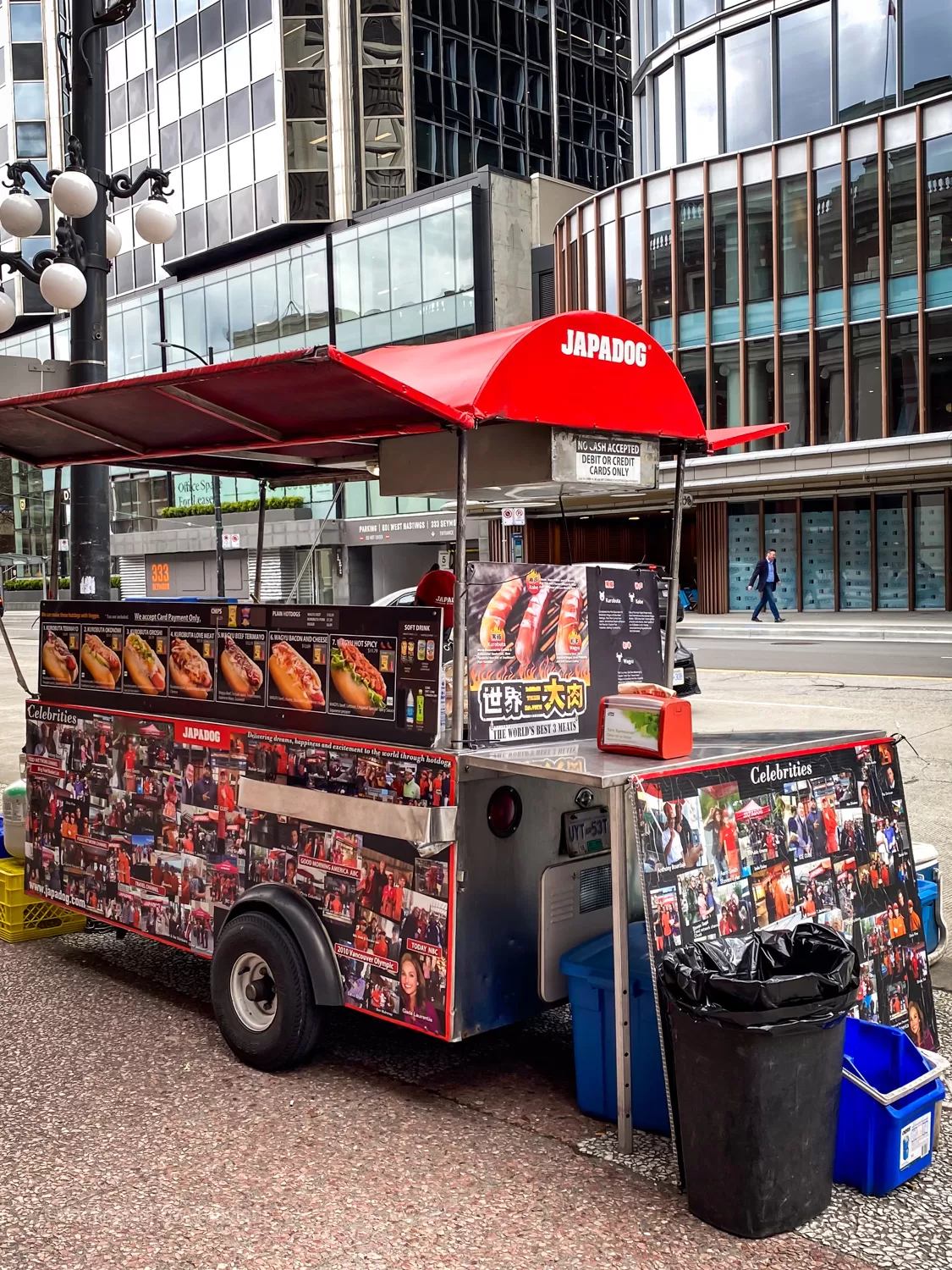 When you walk around Vancouver, you’ll spot several bright‑red food carts labelled “JapaDog,” which is basically a fun twist on your classic hot dog, and I’d say it’s an upgrade. This popular Japanese‑style hot dog chain has taken the city by storm with its unique fusion of flavors. We tried a couple of variations, each featuring an exciting mix of ingredients and toppings.