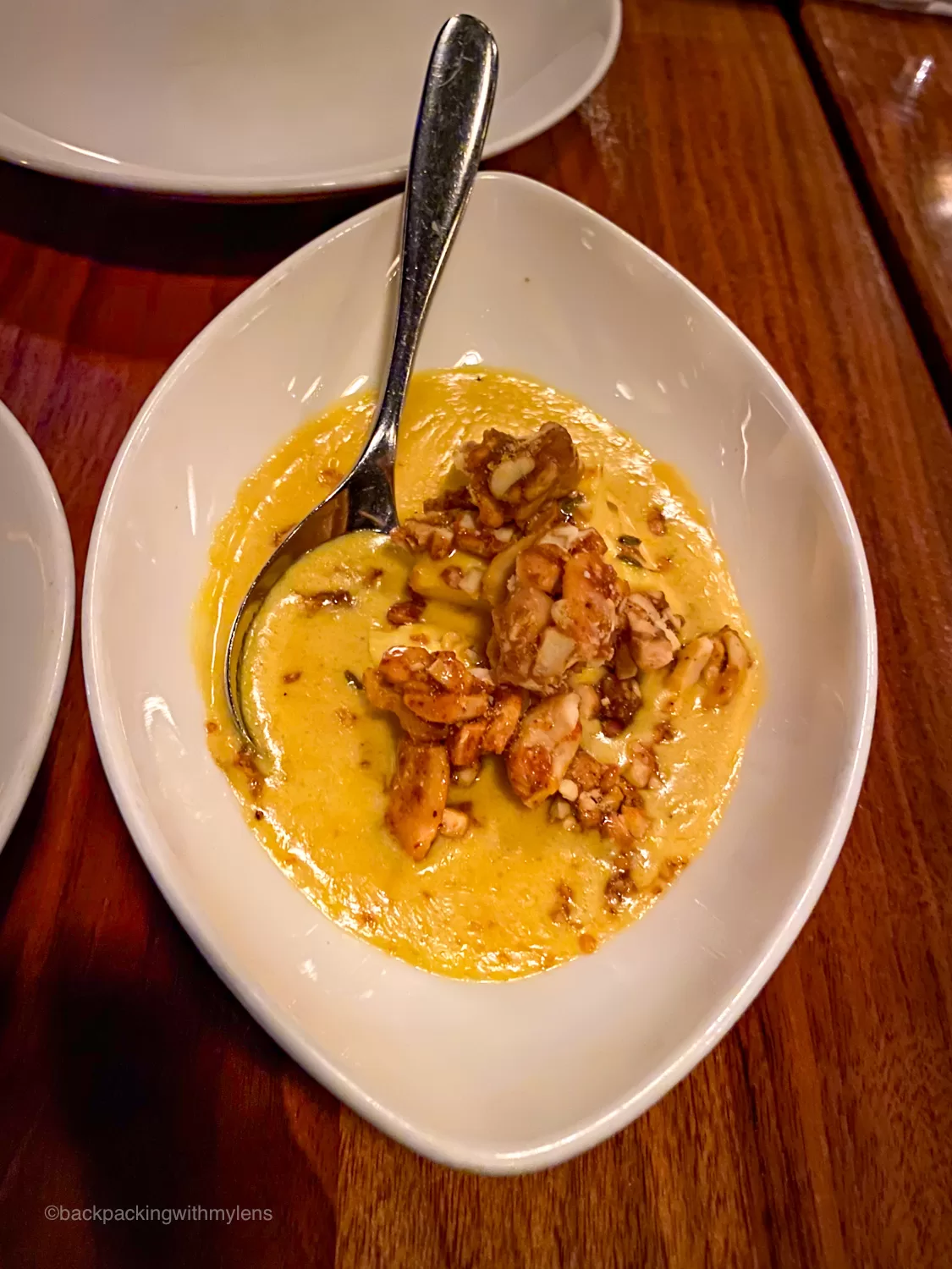 The chef’s special complimentary starters were good, there were two kinds of finger foods, one being a fritter and the other a cracker topped with bean sprouts. For our entrées, we ordered a vegetarian thali and lamb curry with naan. The naan was perfectly soft and buttery, and the lamb curry had good flavors, but we weren’t quite sure what okra was doing in the dish, it felt like an odd combination. The biggest disappointment was the thali; the vegetables were undercooked and extremely bland.